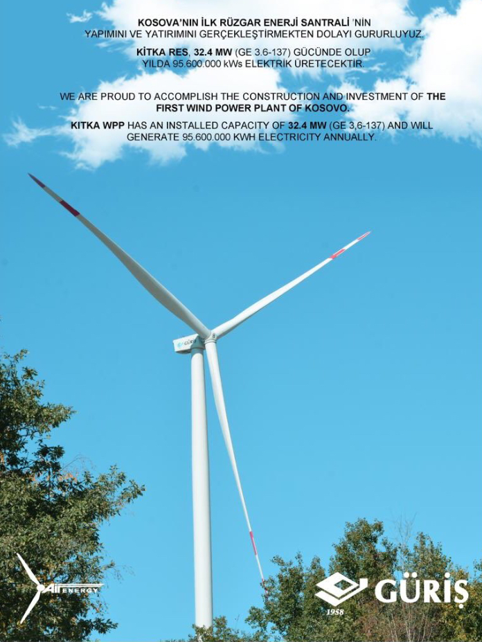 GÜRİŞ’in konuyla ilgili sosyal medya üzerinden yaptığı bilgilendirme şöyle: Kosova’nın ilk rüzgar enerji santrali Kitka RES’imiz son turbinin de devreye alınmasıyla tam kapasite elektrik üretimine başladı.