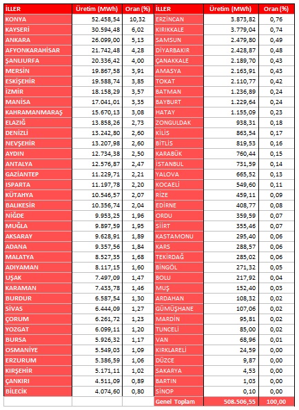 Enerji Piyasası Düzenleme Kurumu (EPDK)'nın son açıkladığı Elektrik Piyasası Aylık Sektör Raporu (Kasım 2018)'e göre lisanssız elektrik üretiminde Konya 52.458 megawatsaat (MWh) üretim ile ilk sırada yer aldı. İkinci sıradaki Kayseri'nin lisanssız elektrik üretimi 30.594 MWh, üçüncü Ankara'nın ise lisanssız elektrik üretimi 26.099 MWh oldu. Kasım ayında Türkiye toplam lisanssız elekrik üretimi ise 508 bin 506 MWh oldu.