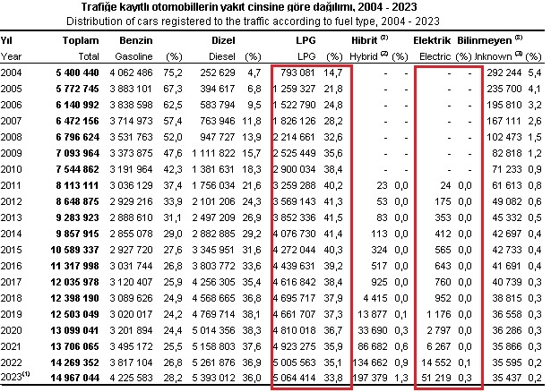 Yıllara göre araç satışlarında ise; son dönemde elektrikli araç satıişları LPG'li araçların önüne geçmiş olsa da, LPG'li araçların daha önce piyasaya girmeleri nedeniyle trafikteki LPG'li araç sayısı, elektrikli araçlara göre daha fazla. TÜİK verilerine göre halen trafiğe kayıtlı toplam 5 milyonun üzerinde LPG'li (Likit Petrol Gazı) araç var. Buna karşın trafiğe kayıtlı toplam elektrikli araç sayısı ise 51 bini geçti. Aynı şekilde trafiğe kayıtlı toplam hibrit araç sayısı ise 197 bini geçti. Trafiğe kayırlı toplam otomobil sayısı ise 14 milyonun üzerinde.