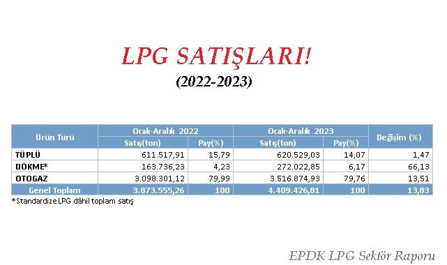 - Türkiye'nin yıl toplamı olarak LPG satışları (otogaz, tüpgaz, dökme gaz) satışları için aşağıdaki tabloya bakınız (2022-2023 dönei karşılaştırması).