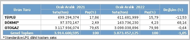 - Kaynak: EPDK LPG Piyasası Sektör Raporu Aralık 2023 (Ürün Türüne Göre LPG Satışlarının Ocak-Aralık 2022 ve Ocak-Aralık 2023 Dönemleri Arası Karşılaştırması).