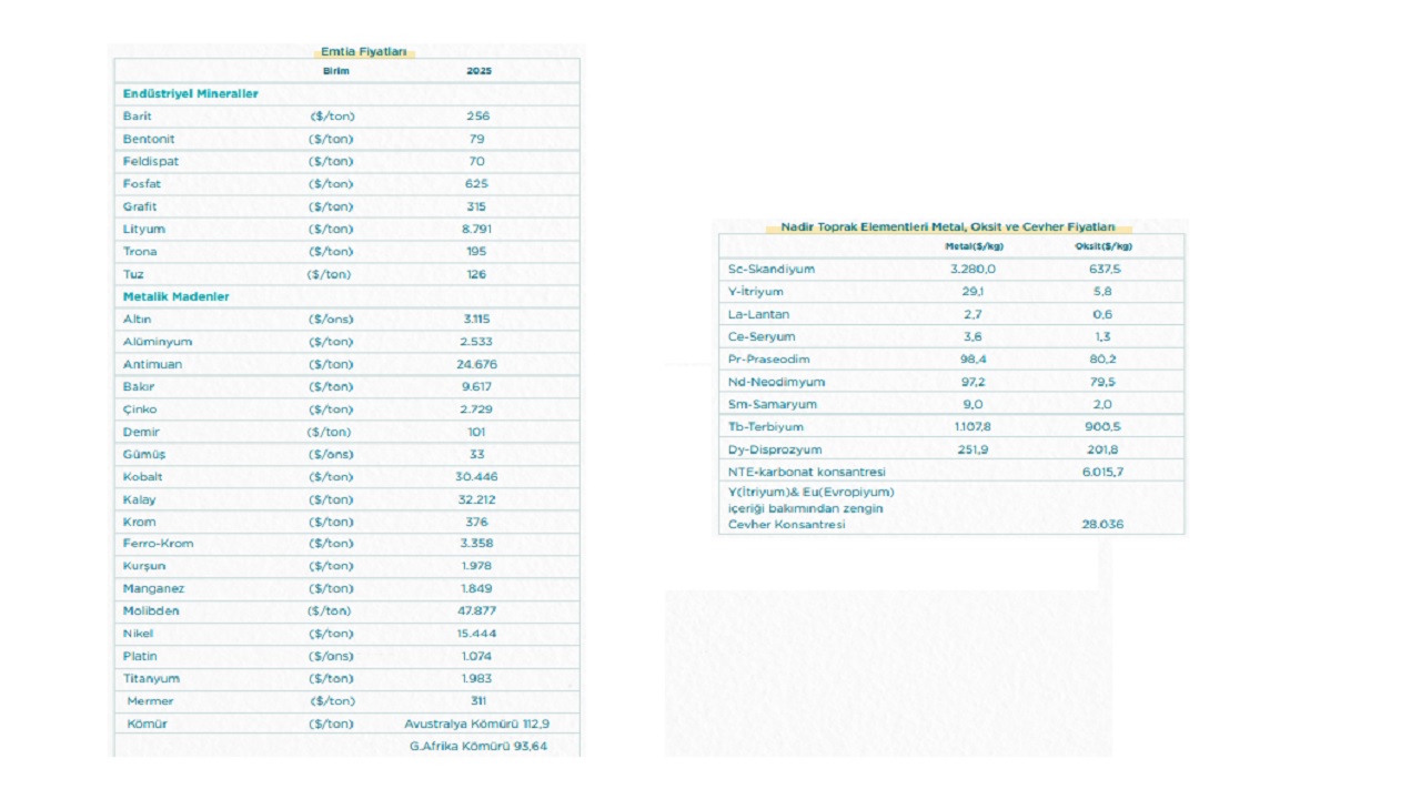 Fiyatlar, LME, The World Bank, USGS, TMMOB Maden fiyatları bülteni, Madencilik Türkiye Dergisi ve çeşitli kuruluşlarından temin edilmektedir
