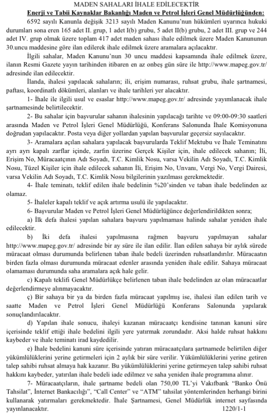 MAPEG, maden sahaları için ihale açtı. Maden ve Petrol İşleri Genel Müdürlüğü (MAPEG)’in ihale duyurusu Resmi Gazete yayınlandı.