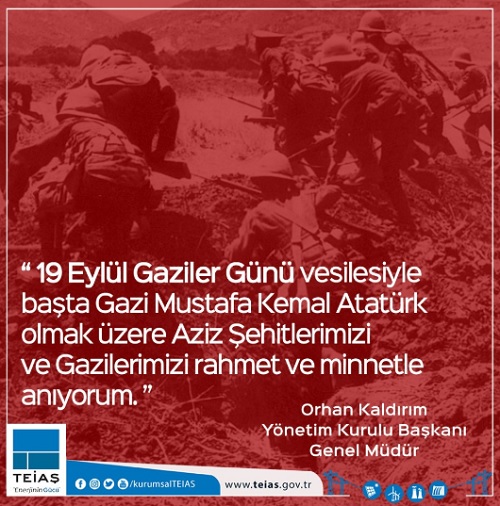Bugün, 19 Eylül Gaziler Günü. Türkiye Elektrik İletim AŞ (TEİAŞ) Genel Müdürü Orhan Kaldırım, 19 Eylül Gaziler Günü nedeniyle bir mesaj yayınladı.