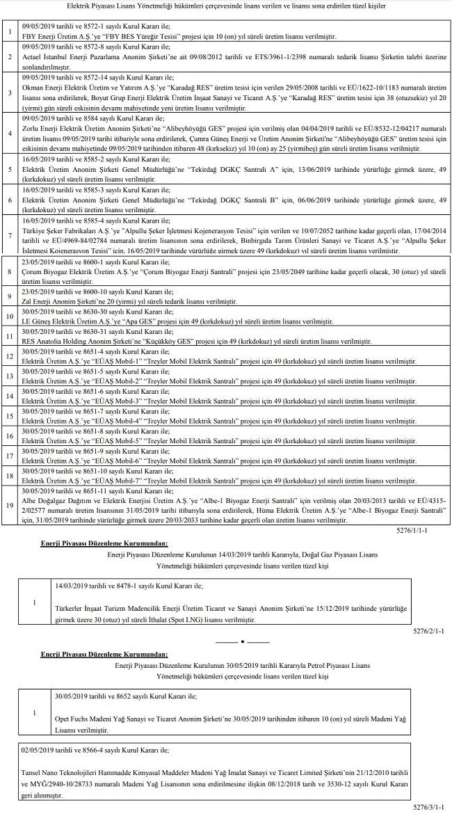 Açıklama: 'Enerji Piyasası Düzenleme Kurumundan: Enerji Piyasası Düzenleme Kurulunun 02/05/2019, 09/05/2019, 16/05/2019, 23/05/2019 ve 30/05/2019 tarihli Kararlarıyla Elektrik Piyasası Lisans Yönetmeliği hükümleri çerçevesinde lisans verilen ve lisansı sona erdirilen tüzel kişiler' (16 Haziran 2019 Tarihli Resmi Gazetede yayınlandı).