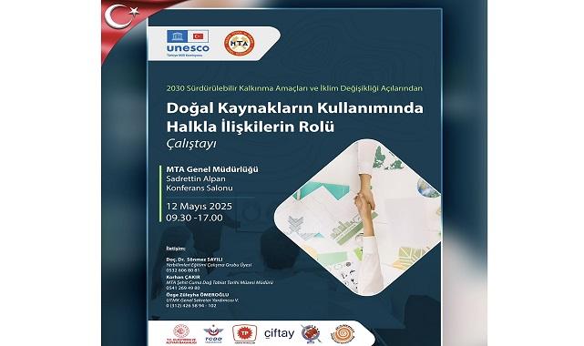 MTA: ''Birleşmiş Milletler (BM) Eğitim Bilim ve Kültür Kurumu (UNESCO) ve Maden Tetkik ve Arama Genel Müdürlüğünün ortaklaşa olarak yapacağı 2030 Sürdürülebilir Kalkınma Amaçları ve İklim Değişikliği Açılarından 12 Mayıs 2025 " Doğal Kaynakların Kullanımında Halkla İlişkilerin Rolü Çalıştayı " saat 09:30-17:00 arasında Sadrettin ALPAN Konferans Salonunda yapılacaktır.''