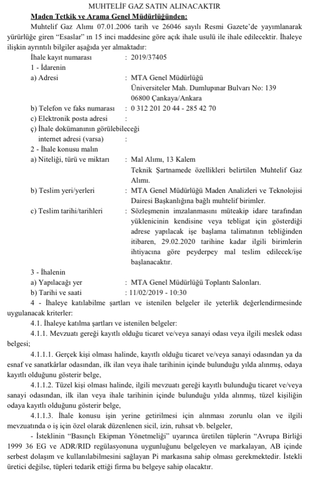 Maden Tetkik Ve Arama Genel Müdürlüğü (MTA), muhtelif gaz satın almak için ihale açtı. MTA ihalesi Resmi Gazetede yayınlandı.