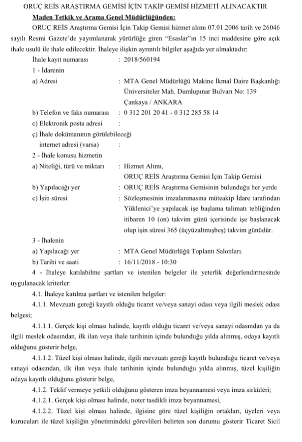 MTA (Maden Tetkik ve Arama Genel Müdürlüğü), bünyesinde sismik çalışmalar yapan Oruç Reis Gemisi için Takip Gemisi hizmet alım ihalesi açtı.