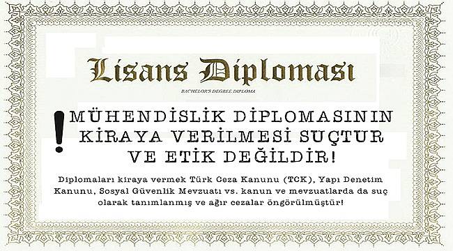 Bilimi ve mesleği insanlık ve kamu yararına kullanmak yerine diplomalarını kiraya vererek usulsüzce para kazanmanın aparatı olarak kullananları uyarıyoruz: Diplomaları kiraya vermek Türk Ceza Kanunu (TCK), Yapı Denetim Kanunu, Sosyal Güvenlik Mevzuatı vs. kanun ve mevzuatlarda da suç olarak tanımlanmış ve ağır cezalar öngörülmüştür.
