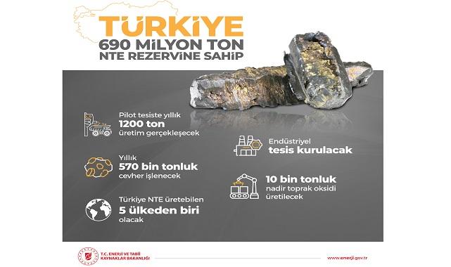 - Enerji ve Tabi Kaynaklar Bakanlığı, 'Türkiye Nadir Toprak Elementleri' konulu son bilgi paylaşımı ile; Türkiye'nin NTE'lerdeki durumunu özetledi. Bakanlık verilerine göre Türkiye toplam 690 milyon ton nadir toprak elementi (nte) rezervine sahip.
