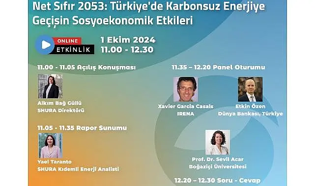 Geçişin ulusal gelir, imalat sanayi ve istihdam üzerindeki etkilerini ele alan ve SHURA Enerji Dönüşümü Merkezi tarafından hazırlanan “Net Sıfır 2053: Türkiye'de Karbonsuz Enerjiye Geçişin Sosyoekonomik Etkileri” raporu bir webinar ile tanıtılacak.