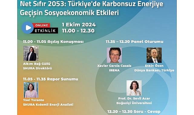 Geçişin ulusal gelir, imalat sanayi ve istihdam üzerindeki etkilerini ele alan ve SHURA Enerji Dönüşümü Merkezi tarafından hazırlanan “Net Sıfır 2053: Türkiye'de Karbonsuz Enerjiye Geçişin Sosyoekonomik Etkileri” raporu bir webinar ile tanıtılacak.