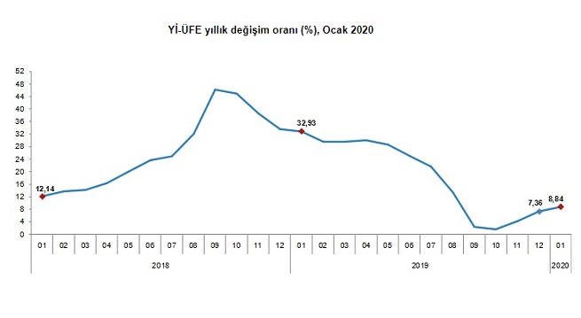 Yurt içi üretici fiyat endeksi (Yİ-ÜFE) yıllık %8,84, aylık %1,84 arttı: Yİ-ÜFE (2003=100) 2020 yılı Ocak ayında bir önceki aya göre %1,84, bir önceki yılın Aralık ayına göre %1,84, bir önceki yılın aynı ayına göre %8,84 ve on iki aylık ortalamalara göre %15,71 artış gösterdi.
