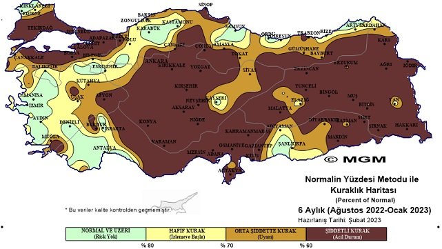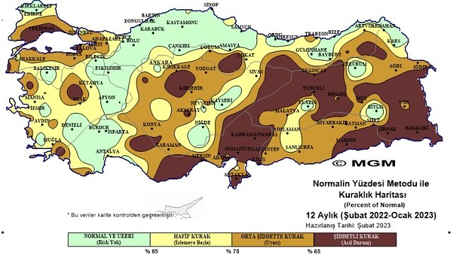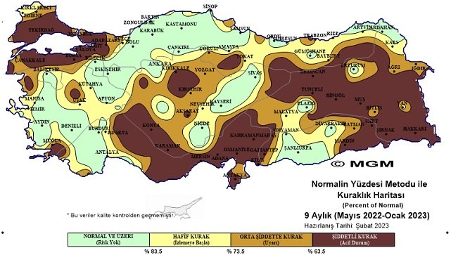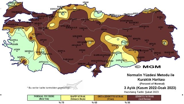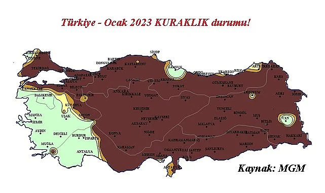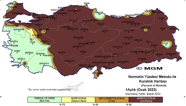 Meteoroloji Genel Müdürlüğü (MGM), 2023 yılının ilk kuraklık haritalarını yayınladı. Türkiye 2023 yılının ilk ayın şiddetli kuraklıkla geçirdi.