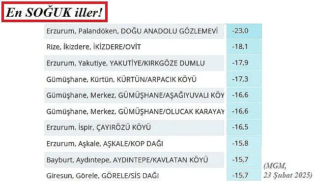 MGM'nin (Meteoroloji Genel Müdürlüğü) verilerine göre (23 Şubat 2025) en soğuk iller: Erzurum Palandöken -23, Rize İkizdere -18,1, Erzurum Yakutiye -17,9 derece.