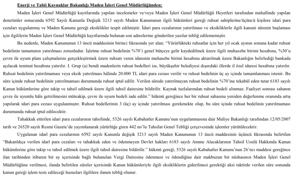 Maden İşleri Genel Müdürlüğü (MİGEM), maden ruhsatlarıyla ilgili kesiilen idari para cezalarınon tahsili konusunda önemli bir duyuru yaptı.