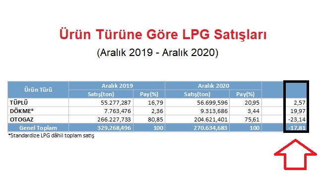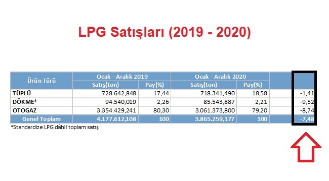 LPG Piyasası Sektör Raporu'na göre Ocak - Aralık dönemindeise Türkiye toplam LPG satışları (Otogaz, tüpgaz, dökme gaz), 3 milyon oldu. Bu rakam 2019 yılı aynı döneminde 3,3 milyon ton olmuştu. Yıllık bazda LPG satışları geçen yıl, bir önceki yıla göre yüzde 7,48 oranında düşüş gösterdi.
