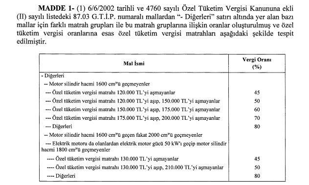 '4760 Sayılı Özel Tüketim Vergisi Kanununa Ekli (II) Sayılı Listede Yer Alan Bazı Malların Özel Tüketim Vergisi Oranlarına Esas Özel Tüketim Vergisi Matrahlarının Yeniden Tespiti Hakkında Karar' ayrıntılarını aşağıda okuyabilirsiniz.Yeni yapılan Özel Tüketim Vergisi (ÖTV) düzenlemesi, motor silindir hacmine göre ÖTV'yi yeniden düzenliyor. İşte yeni yapılan düzenlemenin ayrıntıları...