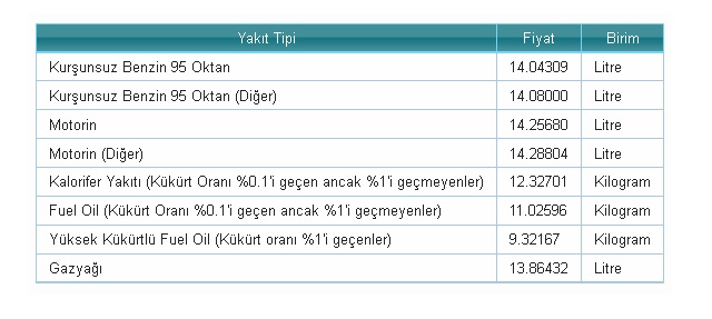 Petrol fiyatları 90 doları aşmasıyla gözler, akaryakıt fiyatlarına çevrildi. EPDK verilerine göre (27 Ocak 2022 Perşembe, Ortalama fiyatlar); 1 litre benzin akaryakıt istasyonlarında 14,0 liraya, motorin 14,2 liraya ve otogazda 9,4 liraya satılıyor (Küsüratlar yuvarlanmıştır. Net rakamlar için aşağıdaki tabloya bakınız).Akaryakıt Fiyatları