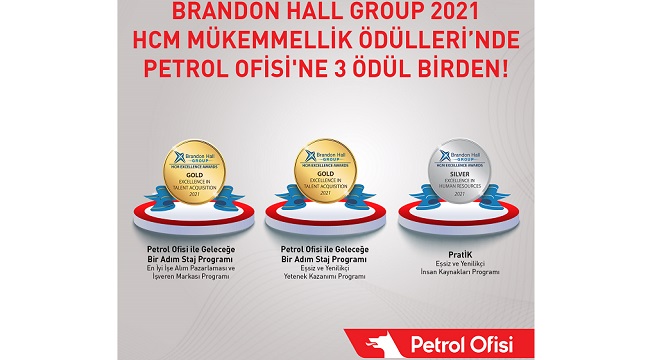 Petrol Ofisi, yapılan değerlendirmede Brandon Hall Group HCM Mükemmellik Ödülleri 2021’de, iki farklı programı ile 3 ödül birden aldı. Petrol Ofisi’nin ‘Petrol Ofisi ile Geleceğe Bir Adım’ online staj programı ‘Eşsiz ve Yenilikçi Yetenek Kazanımı Programı’ ve ‘En İyi İşe Alım Pazarlaması ve İşveren Markası Programı’ kategorilerinde Altın Ödül’e layık görüldü. Petrol Ofisi’nin, Tüm İK süreçlerini online’a taşıdığı ‘İK İş Akışı Yönetim Sistemi: PratİK’ de, ‘Eşsiz ve Yenilikçi İK Programı’ kategorisinde Gümüş Ödül aldı.