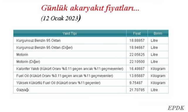- Günlük akaryakıt (benzin, motorin ve diğer ürün fiyatları için aşağıdaki tabloya bakınız.