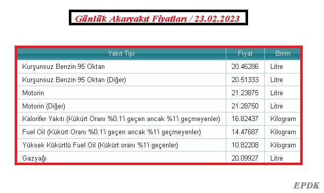 Akaryakıt fiyatları: Öte yandan petrol fiyatlarındaki dalgalanmalar sonrası akaryakıt fiyatları da dalgalı bir seyir izledi. Enerji Piyasası Düzenleme Kurumu (EPDK) verilerine göre 23 Şubat 2023 Perşembe günü günlük akaryakıt fiyatları şöyle (Litre): Benzin (95 oktan kurşunsuz benzin) 20,46 lira. Motorin (Normal motorin) 21,23 lira.