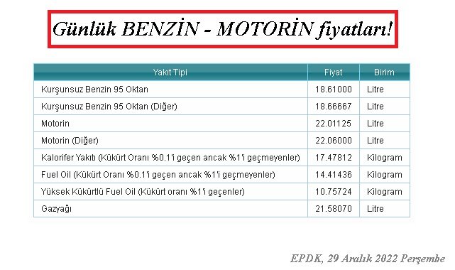 - Günlük benzin motorin fiyatları