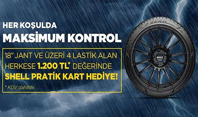 2 Ekim 2023 – 31 Aralık 2023 tarihleri arasında kampanyaya dahil Yetkili Satıcılar veya alt satış noktalarından tek seferde 4 (dört) adet 18’’ jant ve üzeri, Pirellimarka oto, SUV (4x4) yaz, dört mevsim veya kış lastik satın al, 1.200 TL (KDV dahil) değerinde Shell Pratik Kart kazan.