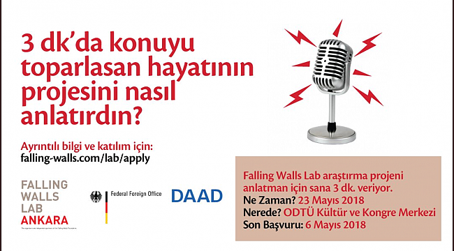 ODTÜ duyurusu: Falling Walls Lab araştırma projeni anlatman için sana 3 dk. veriyor. Ayrıntılı bilgi ve katılım için: falling-walls.com/lab/apply
