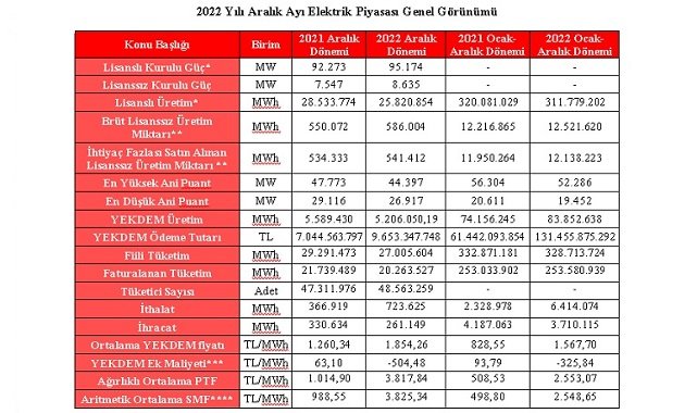 Enerji Piyasası Düzenleme Kurumu (EPDK), 2022 yılı aralık ayı enerji sektör raporlarını yayınladı (elektrik, akaryakıt-petrol, LPG-Likit Petrol Gazı, doğal gaz). Raporların yayınlanması ile 2022 yılı elektrik, petrol, doğal gaz ve LPG sektörü ayrıntıları da (üretim, tüketim, ithalat, ihracat vb) netleşmiş oldu.