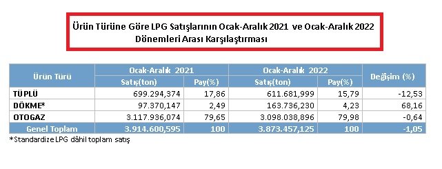 Türkiye 2022 yılında toplam 3 milyon 873 bin 457 ton LPG (Likit Petrol Gazı) tüketti (Otogaz, tüpgaz ve propan. Aralık 2022 sonu itibariyle). En fazla LPG otogaz olarak tüketildi (Toplam otogaz tüketimi 3 milyon ton. Toplam tüketimdeki payı yüzde 79).