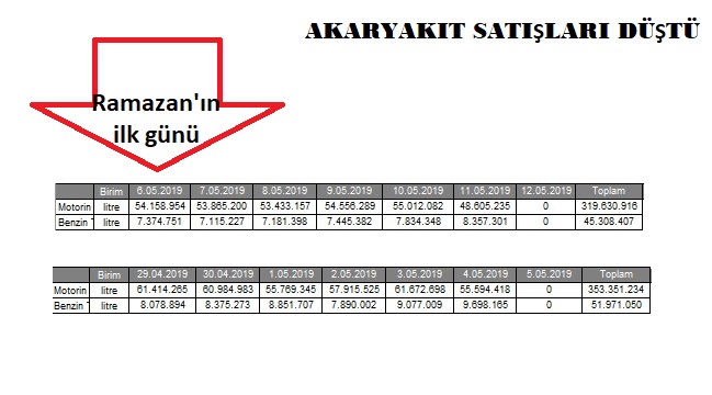 Ramazan'ın ilk günü olan 6 Mayıs itibariyle hem motorin ve hem de benzin tüketimi düşüşe geçti. Ramazan'ın ilk haftasında toplam 319,6 milyon litre motorin ve 45,3 milyon litre benzin tüketimi gerçekleşti.