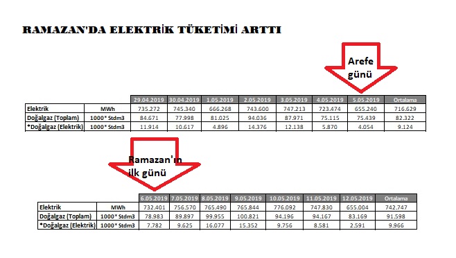 ENERJİ EKONOMİSİ - ÖZEL HABER Ramazan ayının gelmesiyle, elektrik tüketimi de artışa geçti. Ramazan'ın başlangıcı olan 6 Haziran öncesi haftalık ortalama elektrik tüketimi 716 milyon 629 bin kilowatsaat (kwh) iken bu rakam Ramazan ayının ilk haftası 742 milyon 747 bin kilowatsaate çıktı. Benzer şekilde Ramazan öncesi haftalık ortalama 82 milyon 322 bin metreküp olan (m3) olan elektrik amaçlı doğal gaz tüketimi, Ramazamla birlikte haftalık 91 milyon 598 milyon metreküpe çıktı.