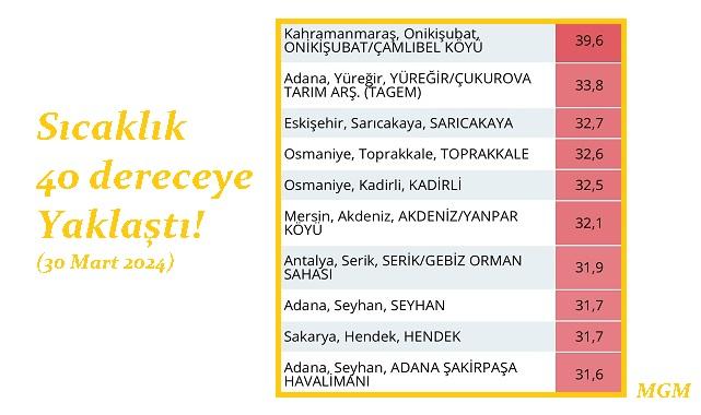 Bu yıl mevsim normallerinin aksine sıcak geçen kış mevsimi sonrası gelen bahar ayları da, yaz sıcaklarını yaşatıyor. Baharın daha ilk günlerinde sıcaklıklar 40 derecelere yaklaştı. Resmi verilere göre dün(30 Mart 2024 cumartesi) Karhramanmaraş (Onikişubat) hava sıcaklığı 39,6 dereceye çıktı. Dün ayrıca çok sayıda ilde haca sıcaklıkları 30 derecenin üzerinde seyretti.