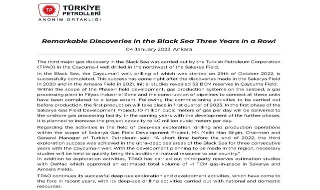 Regarding the activities in the field of deep-sea exploration, drilling and production operations within the scope of Sakarya Gas Field Development Project, Mr. Melih Han Bilgin, Chairman and General Manager of Turkish Petroleum said; "A short time before the end of 2022, the third exploration success was achieved in the ultra-deep sea areas of the Black Sea for three consecutive years with the Çaycuma-1 well. With the development planning to be made in the region, necessary studies will be held to quickly bring this additional natural resource to our country." In addition to exploration activities, TPAO has carried out third-party reserves estimation studies with DeMac which approved an estimated total volume of -1 TCM gas-in-place in Sakarya and Amasra Fields.