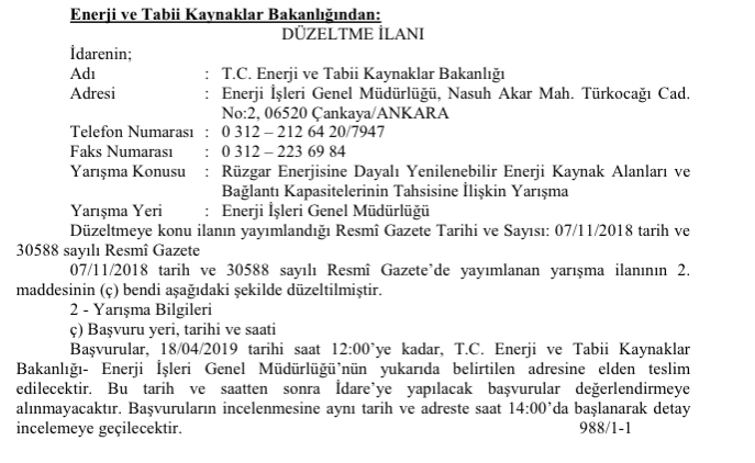 Başvurular 18 Nisan saat 12.00’a kadar Enerji İşleri Genel Müdürlüğü (EİGM)’ye yapılacak.