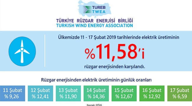 Enerji Ekonomisi - Rüzgar enerjisinden elektrik üretiminde son hafta içinde rekor kırıldı. Türkiye Rüzgar Enerjisi Birliği (TÜREB)'in yeni açıkladığı verilere göre, son bir haftalık (11-17 Şubat 2018) dönemde rüzgar enerjisi santrallerinden (RES) üretilen elektrik Türkiye toplam üretiminin yüzde 11,8'ini karşıladı. En yüksek günlük üretim 14 Şubat Perşembe günü gerçekleşti. Bu rakamla RES santralleri, elektrik üretiminde kendi rekorunu kırmış oldular. RES'lerte haftanın en düşük üretimi ise yüzde 6,59 pay ile 17 Şubat pazar günü gerçekleşti.