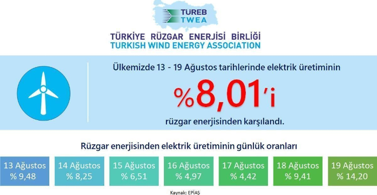 Türkiye Rüzgar Enerjisi Birliği (TUREB)’in açıklamasına göre 13-19 Ağustos 2018 tarihleri arası üretilen toplam elektriğin yüzde 8,1’i rüzgarla çalışan elektrik santrallerinden karşılandı.