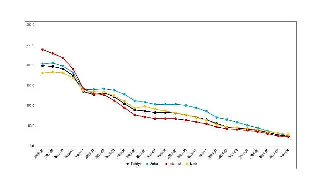 Cari fiyatların yıllık artışlarında tempo kaybı 3 büyükşehir için de geçerlidir. İstanbul’da yüzde 240,9 ile Temmuz 2022’de zirveye ulaşıldıktan sonra düşüş başlamış ve yıllık fiyat artışı Ağustos 2024’te yüzde 23’e gerilemiştir. Ankara ve İzmir'de ise zirveye Eylül 2022’de ulaşılmış, yüzde 205,6 ve yüzde 183,1 olan yıllık artış oranları, Ağustos 2024’te ise bu iki ilimizde sırasıyla, yüzde 25,5’e ve yüzde 28,6’ya gerilemiştir. (Şekil 4)
