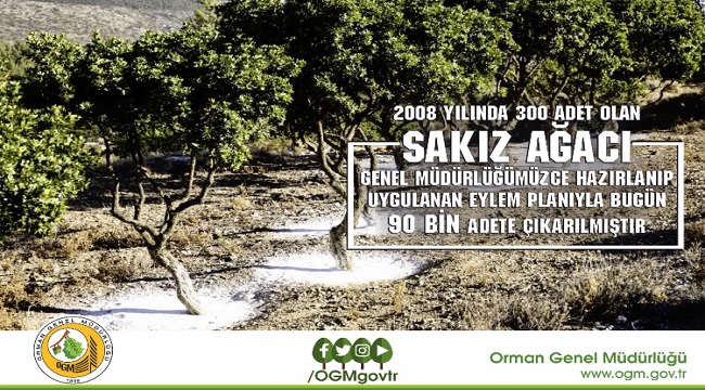 Enerji Ekonomisi - Orman Genel Müdürlüğü (OGM), Sakız Eylem Planı kapsamında alınan mesafeyi açıkladı. OGM, Sakız Eylem Planı kapsamında 2008’de 300 adet olan SAKIZ AĞACI sayısı 90 bine çıkarıldı. OGM, bilgilendirmesini sosyal medya üzerinden yaptı.