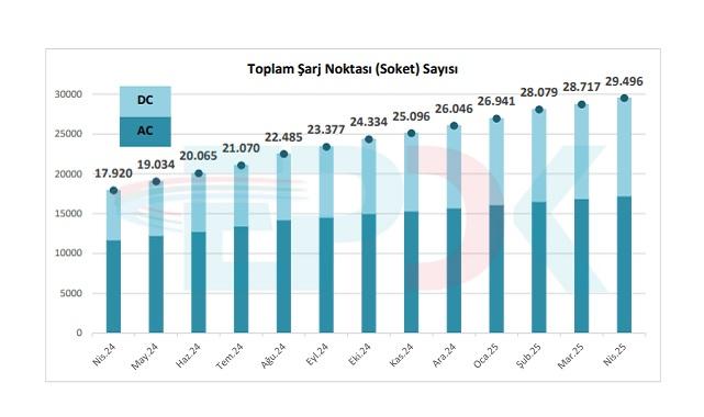 Resmi verilerie göre (EPDK) Türkiye'de elektrikli araç şarj istasyonu sayısı 30 bine yaklaştı. Son açıklanan veriler göre Türkiye'de toplam 29.496 adet (DC, AC) şarj istasyonu (noktası) var. Şarj istasynu son 12 ayda 17.920'den 29.436'ya yükseldi (Nisan 2024 - Nisan 2025).