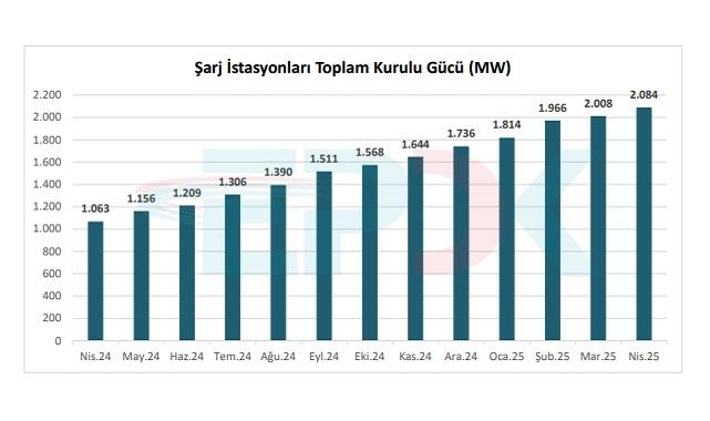 Şark istasyonu sayısındaki artışa paralel, şarj istasyonları kurulu gücü de artıyor. EPDK verilerine göre, Nisan 2025 sonu itibariyle Türkiye'de şarj istasynları kurulu gücü 2.0084 MW (megavata) çıktı.