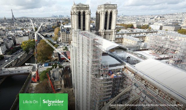 Enerji yönetimi ve otomasyonda dijital dönüşüm lideri Schneider Electric, bağışları aracılığıyla Paris’teki Notre Dame Katedrali’nin restorasyonuna katkıda bulunmaktan büyük onur duymaktadır. Bağışlanan çözümler sayesinde, katedralin elektrik altyapısı güvence altına alınmış ve izlenebilir hale getirilmiştir. Bina Yönetim Sistemi (BMS), anıtın enerji tüketimini yönetip optimize ederek, 21. yüzyılın yeniliklerini 1991 yılından bu yana UNESCO Dünya Mirası Listesi’nde yer alan, Orta çağ sanatının zirvesi olan katedrale entegre etmiştir.