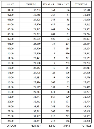 - Veriler için kaynak: TEİAŞ (Türkiye Elektrik İletim AŞ) YTBS (Yük Tevzi Bilgi Sistemi Başkanlığı). 31 Mart 2024 pazar günü, günlük tüketimler).
