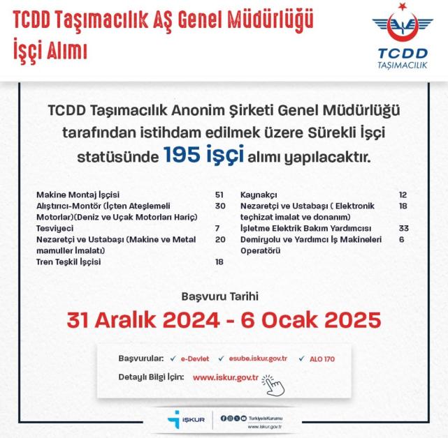 TCDD Taşımacılık AŞ Genel Müdürlüğü tarafından 195 Kişilik İşçi Alım İlanı Başvuruları Başladı!