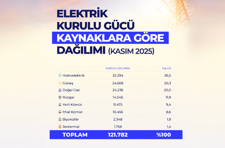 Türkiye’nin elektrik kurulu gücü, Kasım ayında 121 bin 782 megavata çıktı. Yenilenebilir enerjinin kurulu güç içindeki payı, Kasım’da da yükselmeyi sürdürdü. Toplam elektrik kurulu gücünün, yüzde 62’sine karşılık gelen 75 bin 615 megavatlık kısmını yenilenebilir enerji oluşturdu.