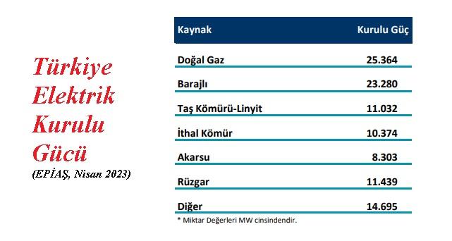 Elektrik Piyasaları İşletme Anonim Şirketi (EPİAŞ), Nisan 2023 sonu itibariyle Türkiye elektrik enerjisi kurulu güç verilerini açıkladı. Buna göre elektrik enerjisi kurulu gücünde doğal gaz 25,3 bin MW ile birinci, HES'ler 23,2 bin MW ile ikinci ve Rüzgar (RES) 11,4 bin MW ile üçüncü sırada yer aldı.