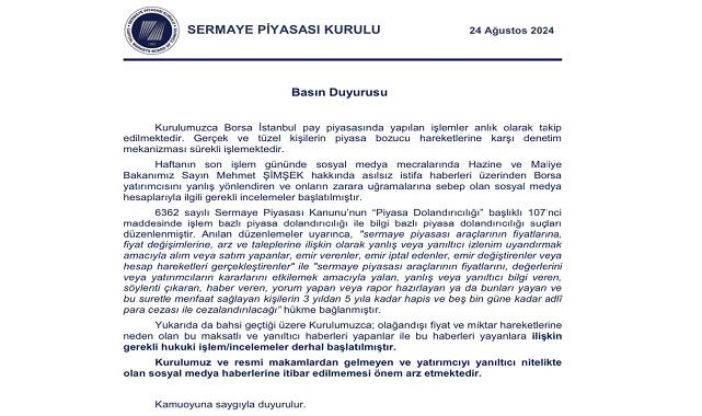 “Kurulumuzca; olağandışı fiyat ve miktar hareketlerine neden olan maksatlı ve yanıltıcı haberleri yapanlar ile bu haberleri yayanlara ilişkin gerekli hukuki işlem-incelemeler derhal başlatılmıştır.”