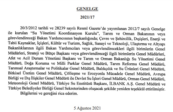 Su Yönetimi Koordinasyon Kurulu, yeniden belirlendi. Konuyla ilgili 'Su Yönetimi Koordinasyon Kurulu ile İlgili 2021/17 Sayılı Cumhurbaşkanlığı Genelgesi' bugünkü Resmi Gazetede yayınlandı (06.08.2021 tarihli).