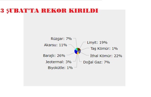 TEİAŞ (Türkiye Elektrik İletim AŞ) YTBS (Yük Tevzi Bilgi Sistemi) verilerine göre 6 Şubat'ta (yani dün) üretilen toplam elektriğin yüzde 32' barajlardan üretildi. Yani, yerli kaynak olan sulardan. Toplam üretimin yüzde onu diğer bir yerli kaynak olan rüzgardan elde edildi. Rüzgarında elektrik üretiminde payı yüzde 10'a çıkarak yeni bir rekor kırılmış oldu. Yine yerli bir enerji üretim kaynağı olan jeotermalin payı da yüzde 2'ye çıktı. Elektriğin geri kalan üretimi ise doğalgaz, ithal - yerli kömür ve diğer kaynaklardan elde edildi.
